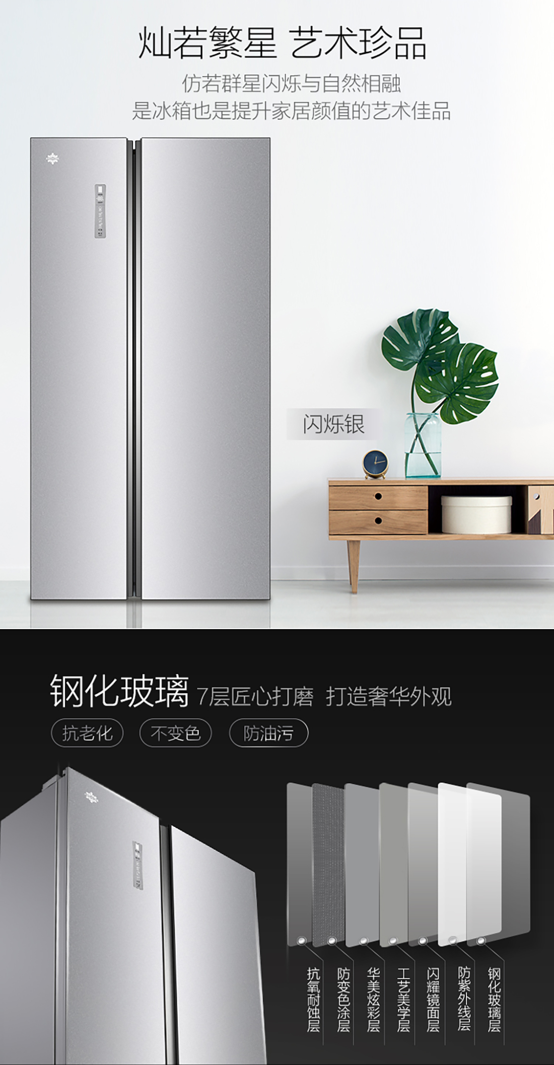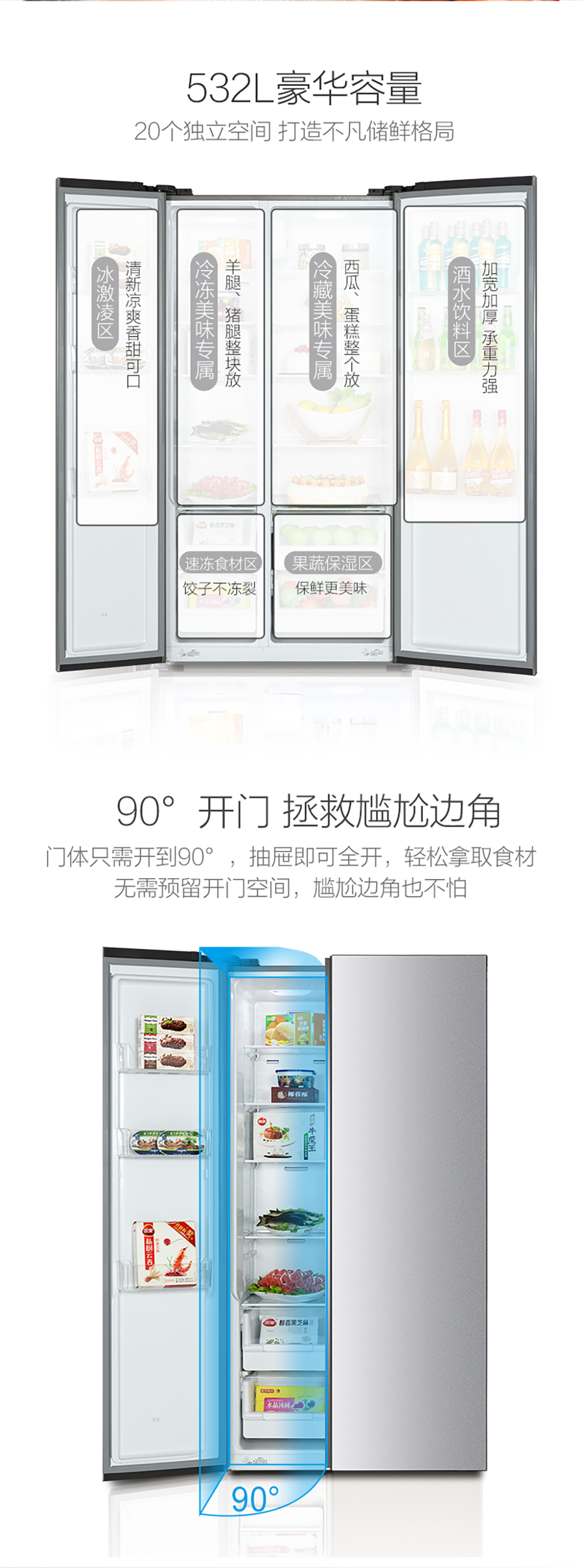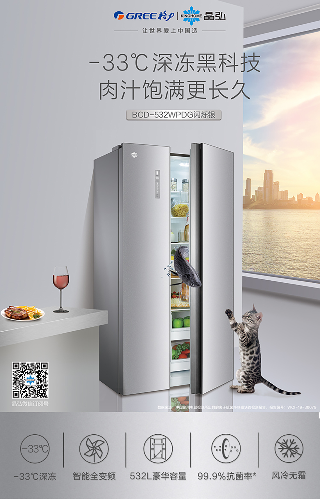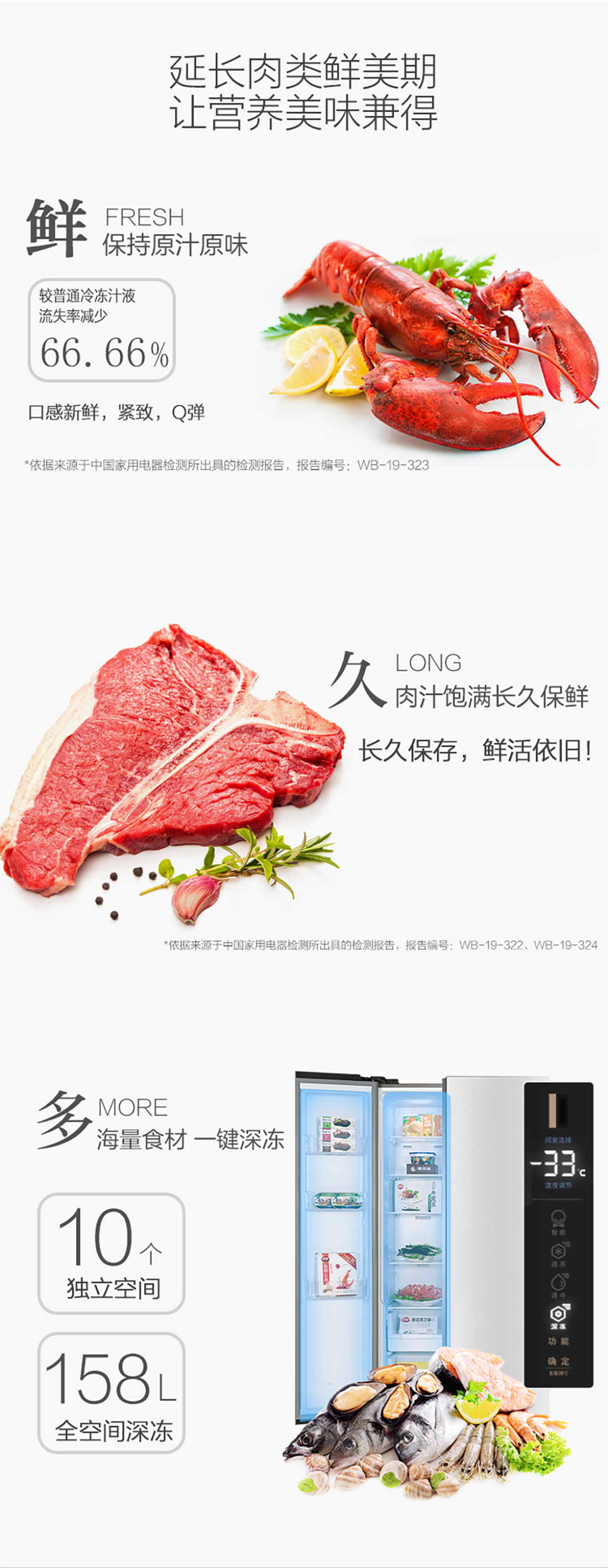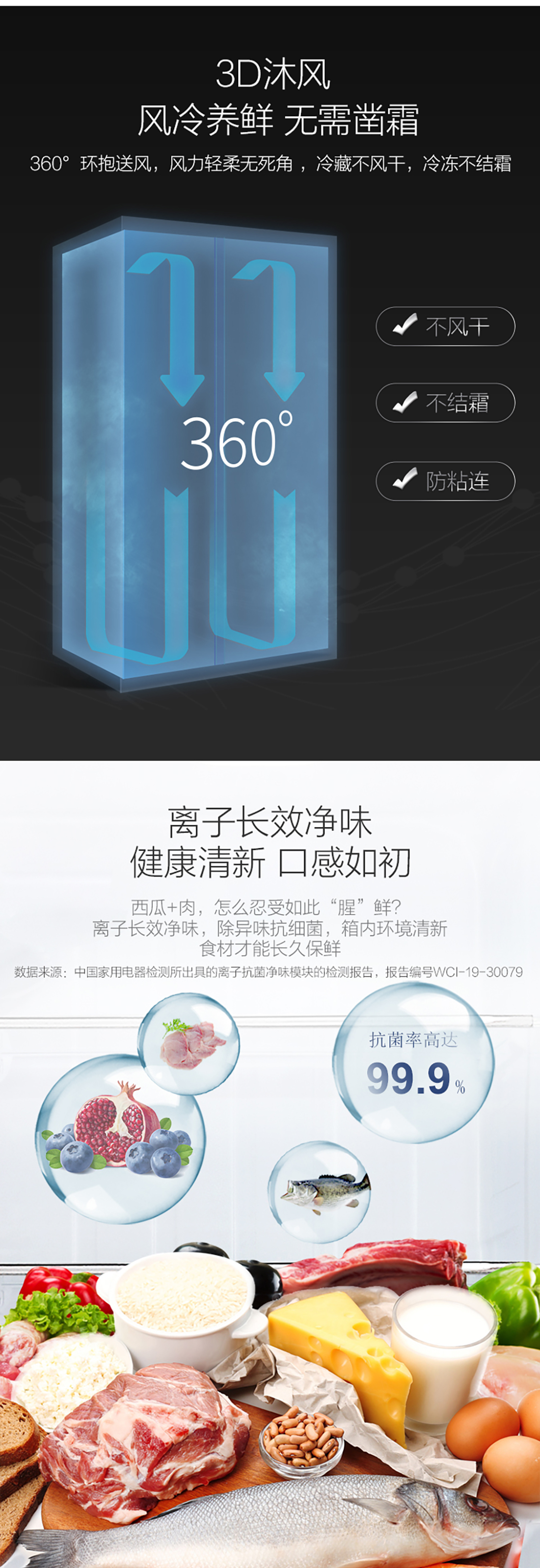 搭載-33℃深凍鎖鮮科技,肉汁飽滿更長久。采用離子長效抗菌凈味,抗菌率高達(dá)99.9%。3D沐風(fēng),風(fēng)冷養(yǎng)鮮,無需鑿霜。