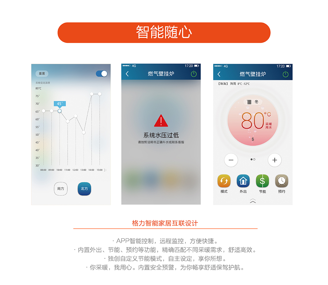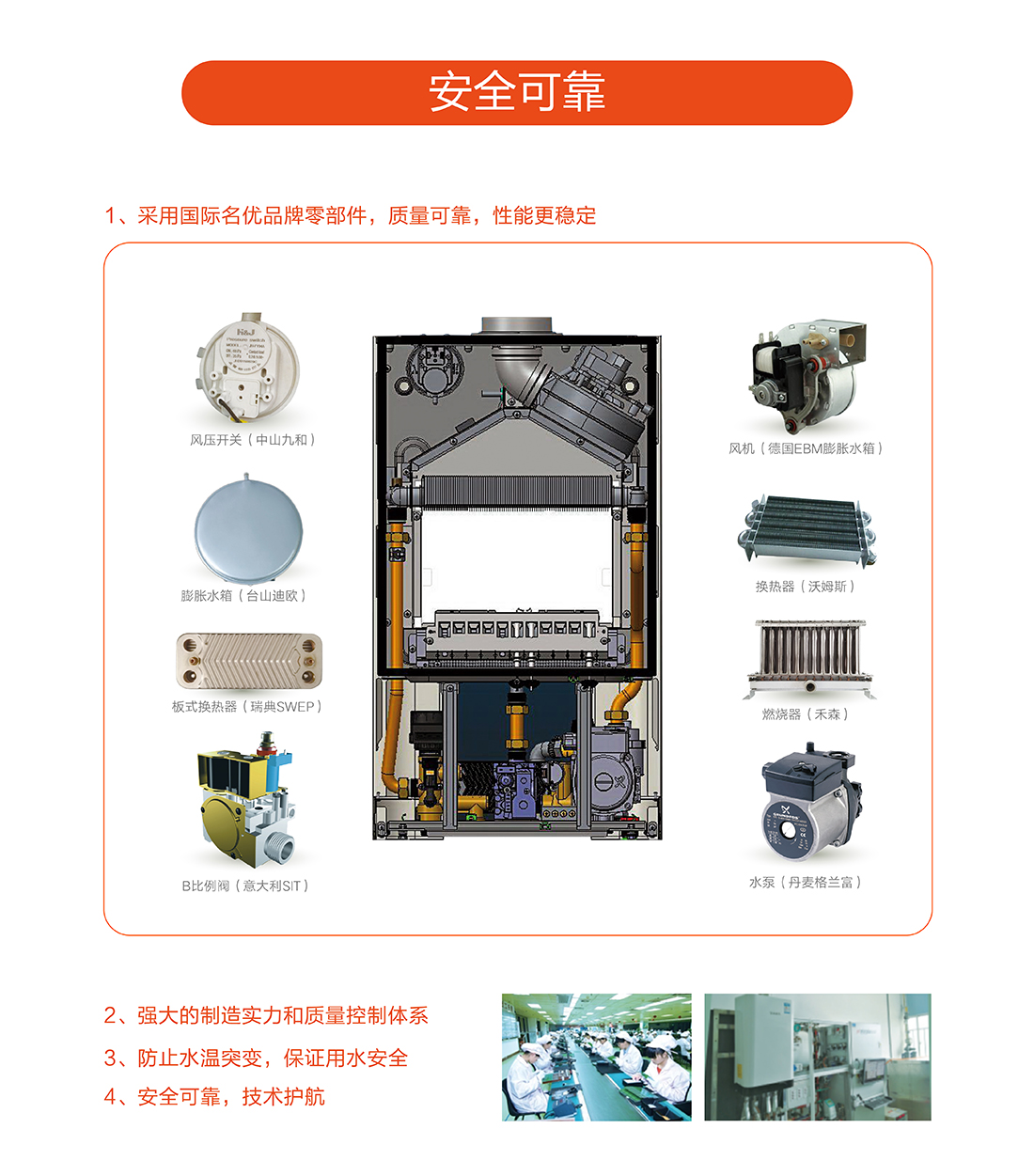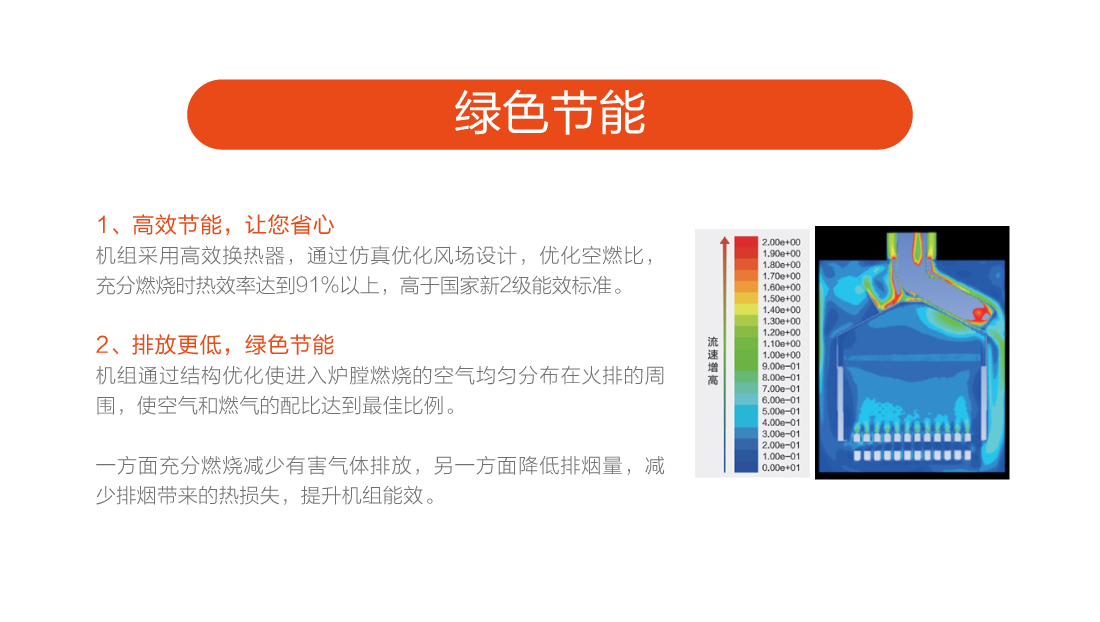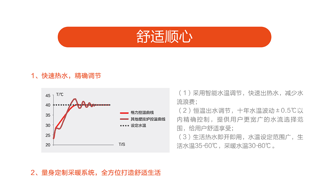 充分燃燒效率達(dá)到90%以上,采用智能水溫調(diào)節(jié),快速出熱水,減少水流浪費,恒溫±0.5℃以內(nèi)精確控制,生活水溫度35-60℃,采暖水溫30-80℃。