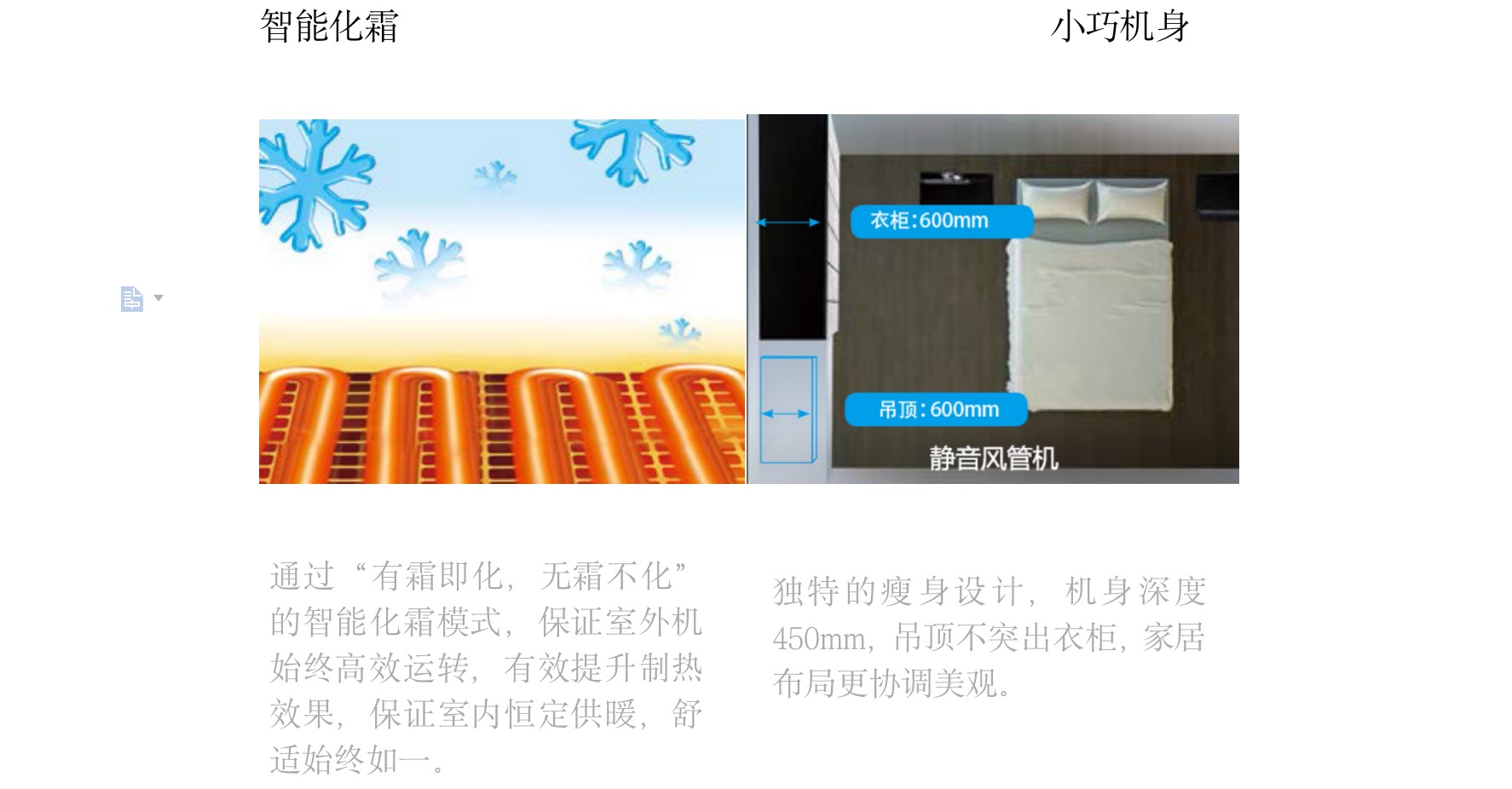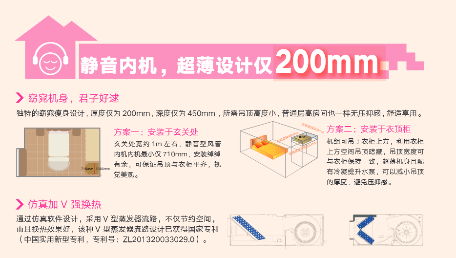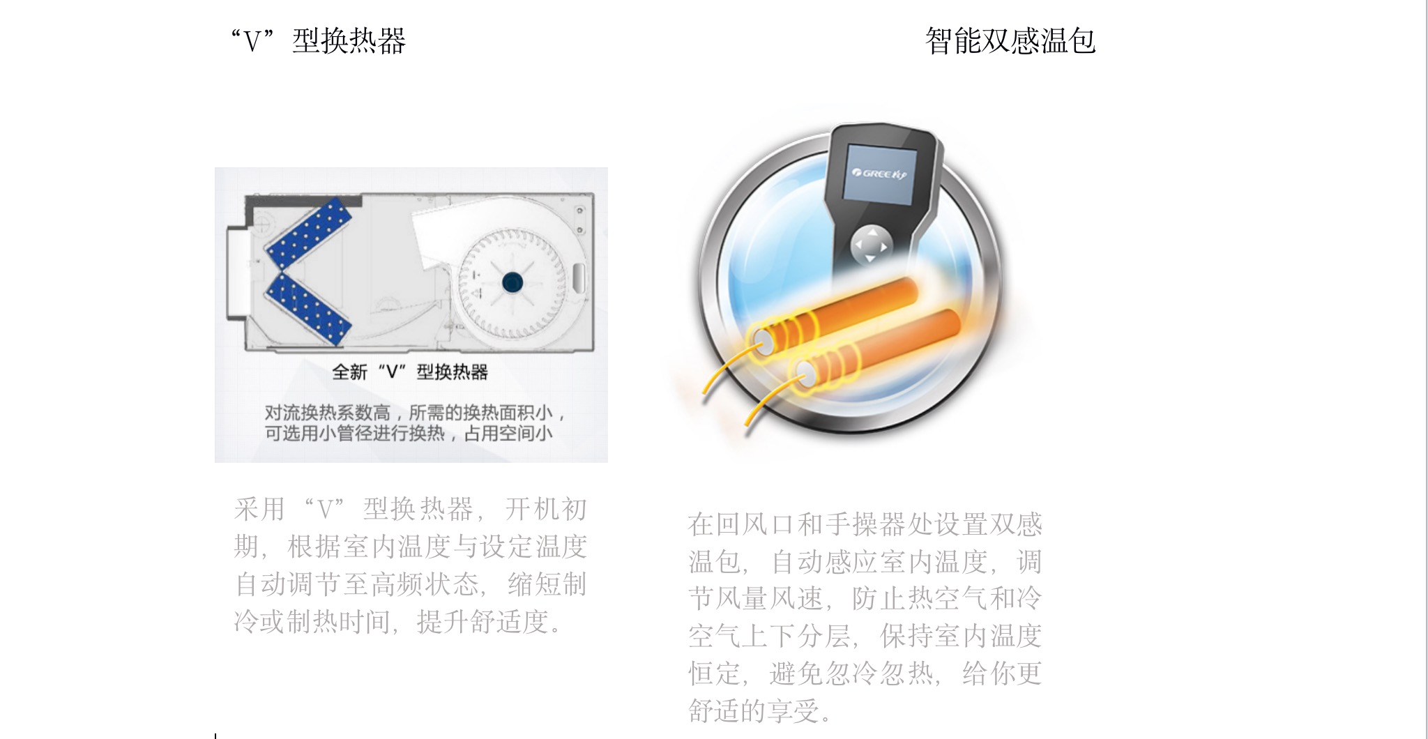采用“V”型換熱器,開機(jī)初期,根據(jù)室內(nèi)溫度與設(shè)定溫度自動調(diào)節(jié)至高頻狀態(tài),縮短制冷或制熱時(shí)間,提升舒適度